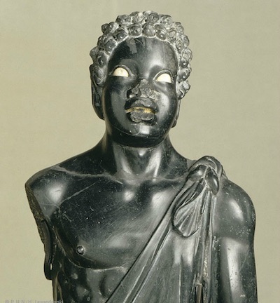 Discovered in the ancient baths of Aphrodisias in what is now Turkey, the decorative statuette in black marble shows evidence of the taste for the exotic in the Roman Empire. The statuette depicts a a young slave wearing a short tunic gathered at the waist and fastened over his shoulder; in his left hand he holds a flask of perfumed oil. Ethiopian slaves often worked in the baths during the late second and early third centuries BCE.
